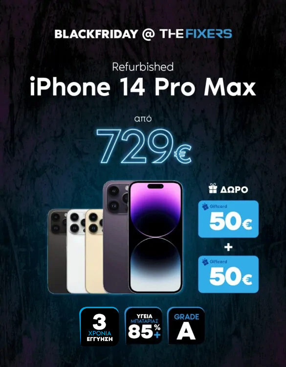 Η ενέργεια ισχύει αποκλειστικά για αγορές σε Refurbished iPhone 14 Pro Max ή Refurbished iPhone 15 Pro max που θα γίνει εντός του παραπάνω χρονικού διαστήματος.