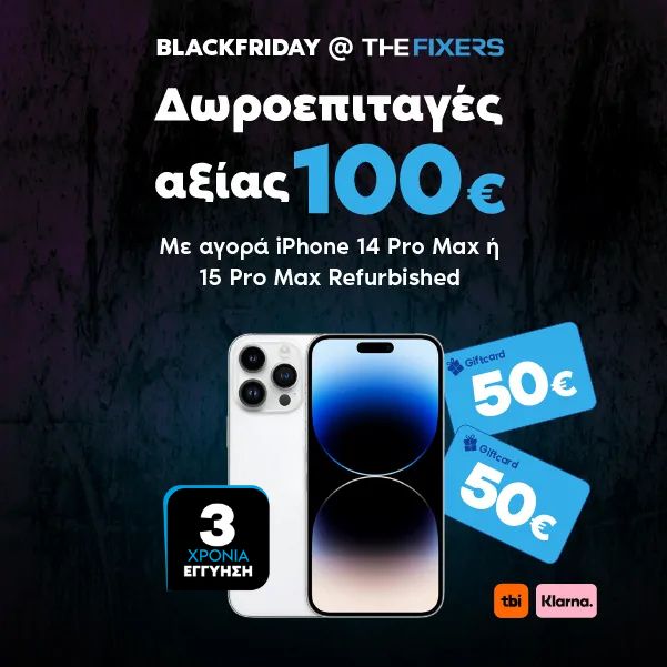 Ναι, οι The Fixers προσφέρουν Black Friday deals σε refurbished iPhone, συσκευές σαν καινούριες, πλήρως ελεγμένες και με 3 χρόνια εγγύηση. Επιπλέον, θα βρεις συμβατά αξεσουάρ για iPhone και Apple Watch, όπως θήκες, καλώδια και powerbanks, όλα σε Black Friday τιμές. Αν λατρεύεις την Apple, αυτή είναι η ευκαιρία να ανανεώσεις τη συσκευή σου έξυπνα και οικονομικά. Σημαντική σημείωση: Η περίοδος Black Friday δεν είναι επίσημη περίοδος εκπτώσεων ή προσφορών. Στους THEFIXERS επιλέγουμε και σου προσφέρουμε συγκεκριμένα αγαπημένα σου προϊόντα στην καλύτερη δυνατή τιμή!